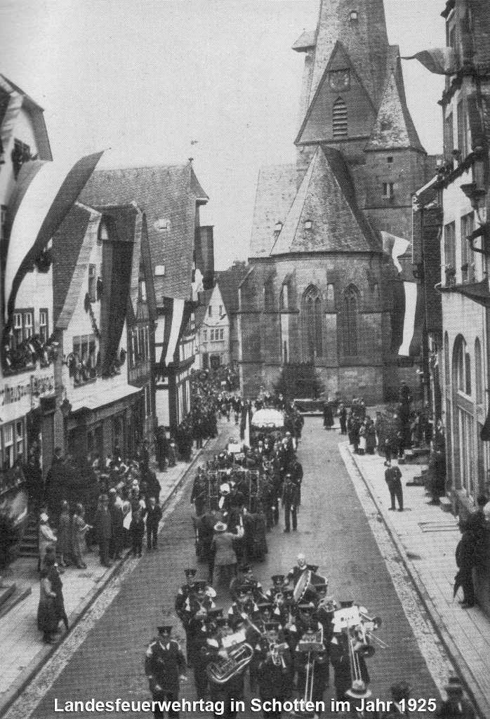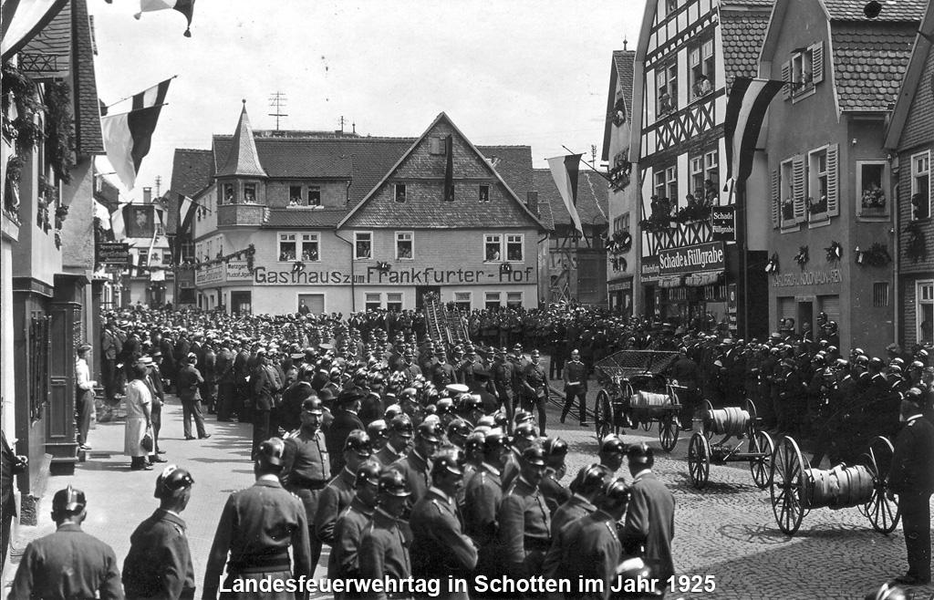 Zwei für Schotten außergewöhnliche Ereignisse waren der Provinzialfeuerwehrtag 1925, der zahlreiche Wehren aus Oberhessen nach Schotten lockte und in dessen Mittelpunkt eine von vielen Zuschauern begleitete Übung in der Schottener Innenstadt stattfand und der 1933 unter der Anwesenheit des Großherzogs Ernst Ludwig von Hessen abgehaltene Landesfeuerwehrtag.