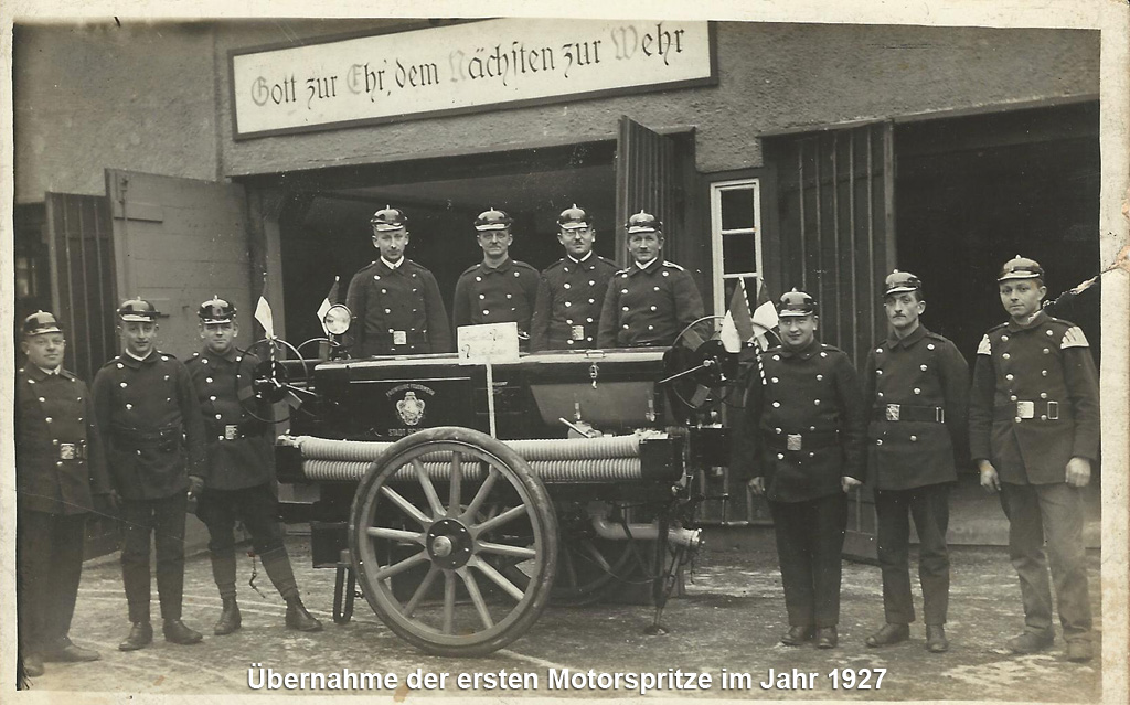 Als zwingende Notwendigkeit erwies sich sodann unter der Führung eines bezahlten Spritzenmeisters (4 Gulden im Jahr) die Aufstellung einer Löschmannschaft, die zunächst aus 20 ausgewählten jungen Bürgern bestand.